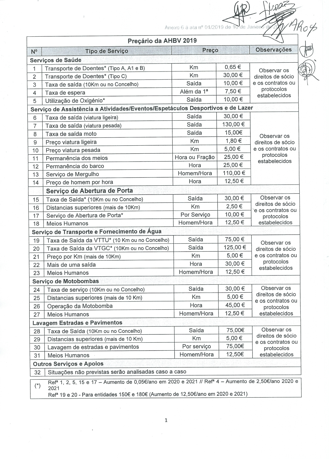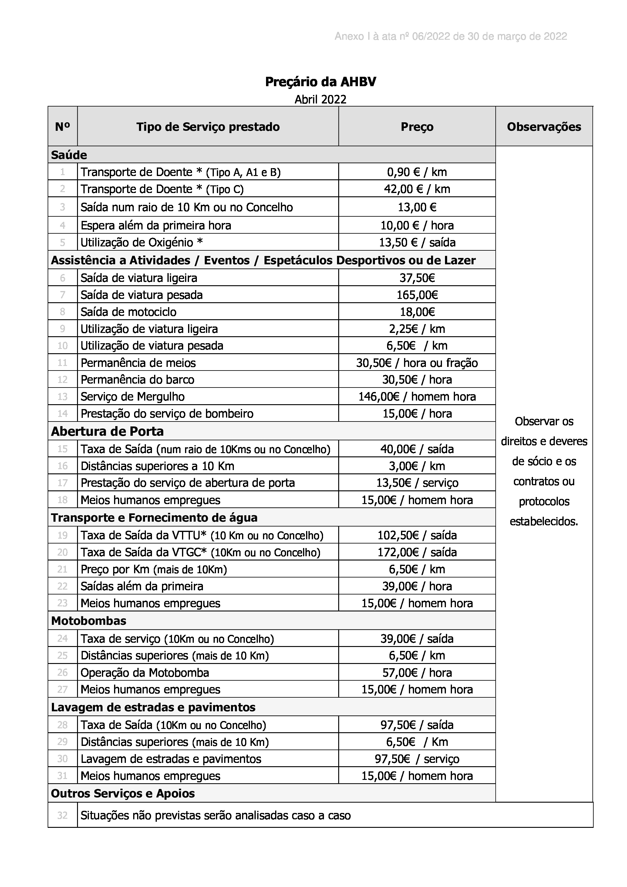Os valores pagos pelos serviços prestados não haviam sido atualizados desde 2003 (15 anos). O presente preçário foi aprovado em 10 de Janeiro de 2019 (acta nº 01/2019, de 10 de Janeiro), passando a vigorar a partir da mesma data.